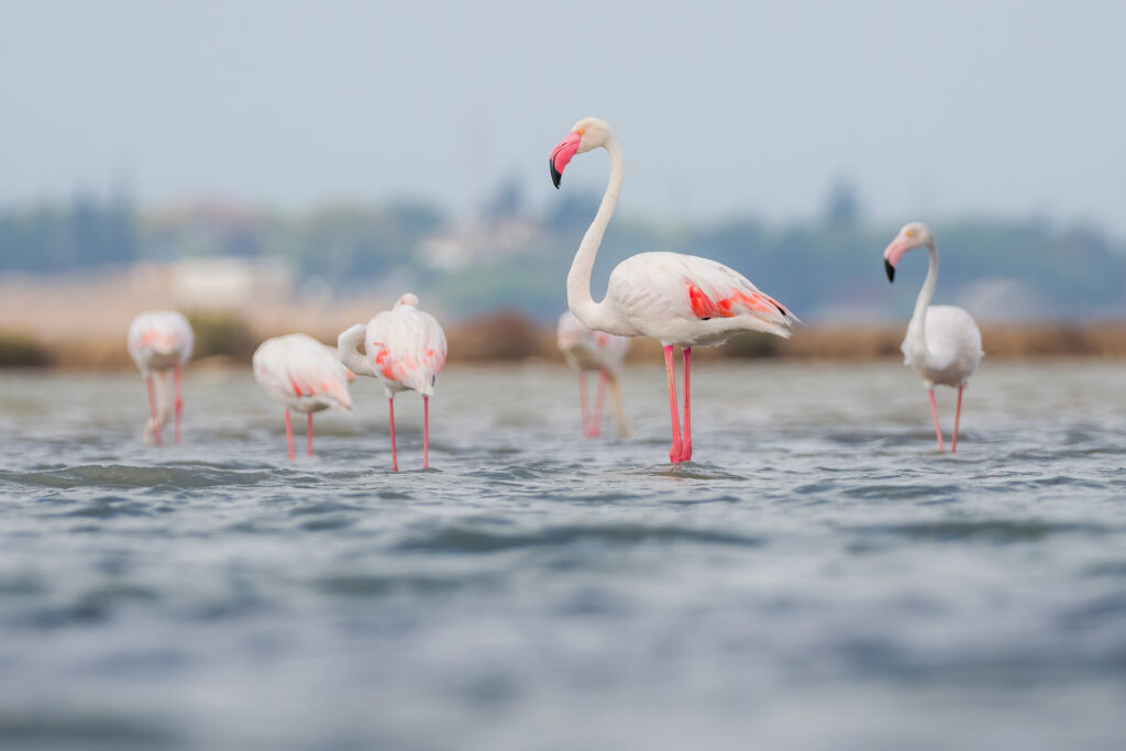 Out in the saltpans by the river banks, Flamingos and Spoonbills forage on the water surface, and, at the right time of the year, massive flocks of Calidris Sandpipers (Dunlins, Little Stints and Curlew Sandpipers, among others) feed on the shallow extensions of mudflat. The drier, salty areas with scattered bushes host a small sedentary population of the scarce, but locally common Mediterranean Lesser Short-Toed Lark.